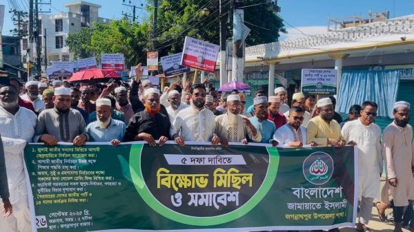 শাহ্ ফুজায়েল আহমদ,বিশেষ প্রতিনিধিঃ সুনামগঞ্জের জগন্নাথপুর উপজেলা জামায়াতের উদ্যোগে কেন্দ্র ঘোষিত ৫ দফা গণদাবি আদায়ের লক্ষ্যে জগন্নাথপুর উপজেলায় ২৬ সেপ্টেম্বর শুক্রবার বেলা ২ ঘটিকার সময় বিক্ষোভ মিছিল ও সমাবেশ অনুষ্ঠিত